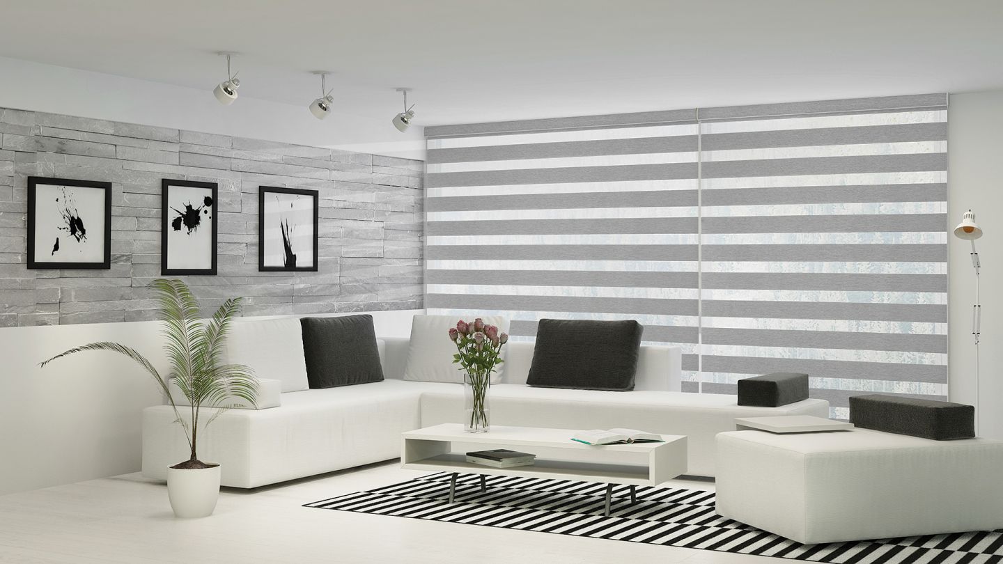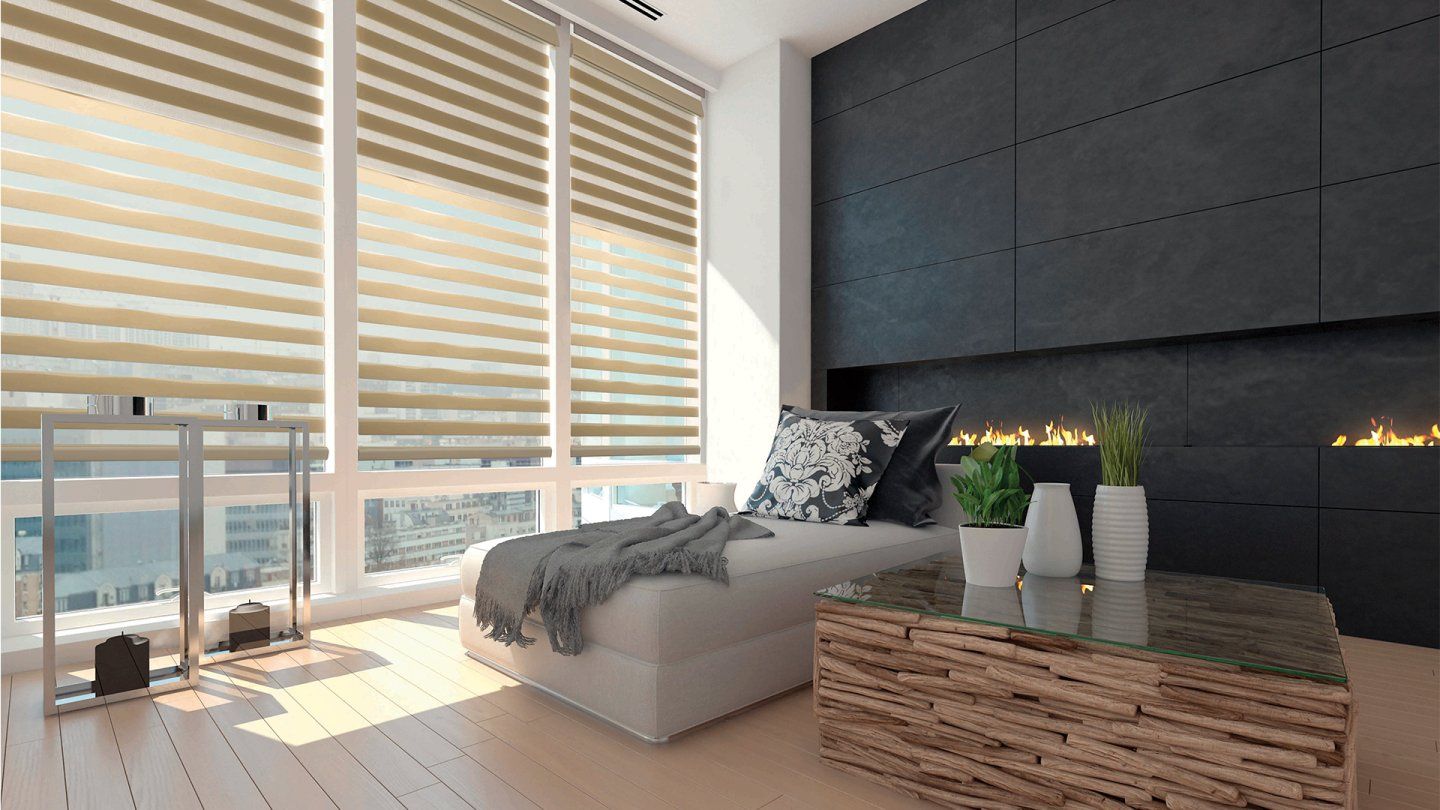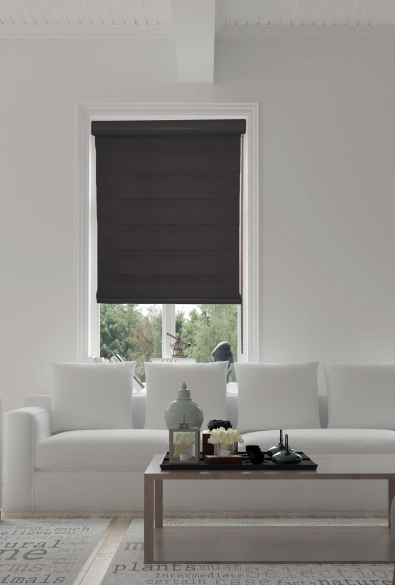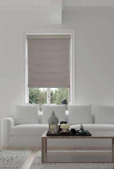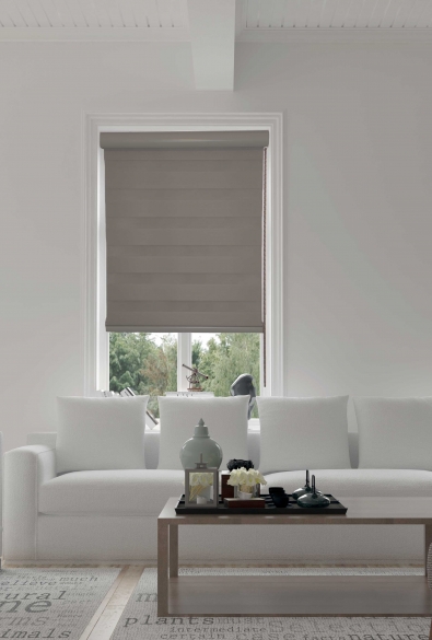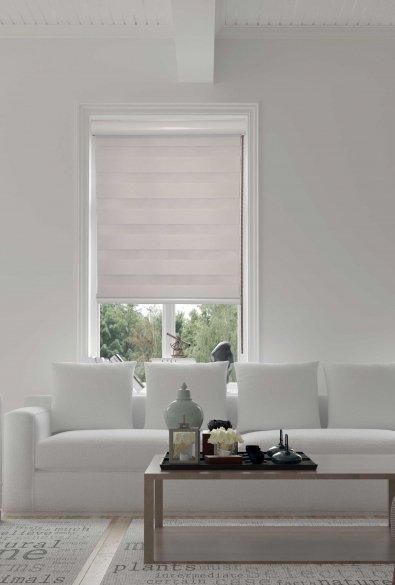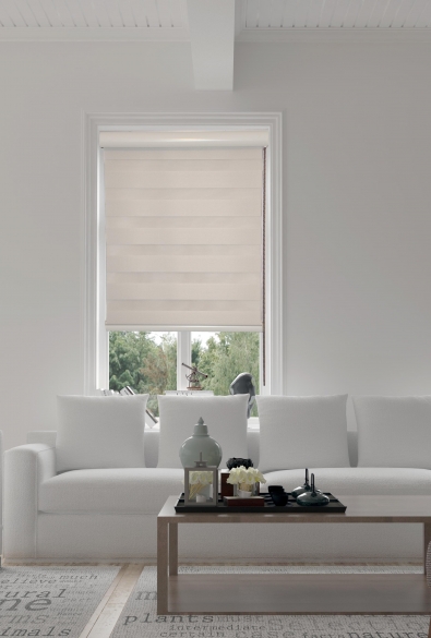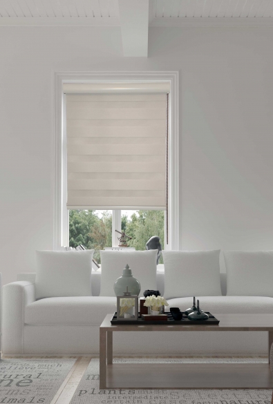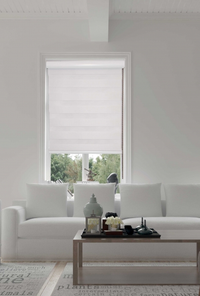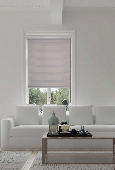 Ce store, créé en 2010, permet d’alterner entre une position de jour, qui jumelle les voilages des 2 toiles vous permettant une vision vers l'extérieur, et une position de soir qui déplace les bandes translucides de façon à vous offrir l'intimité la plus totale, et ce, peu importe la couleur ou la texture.