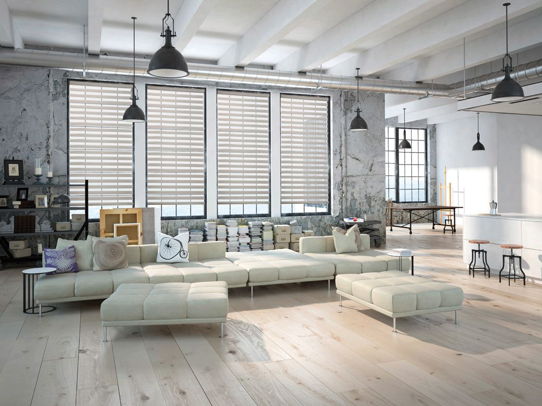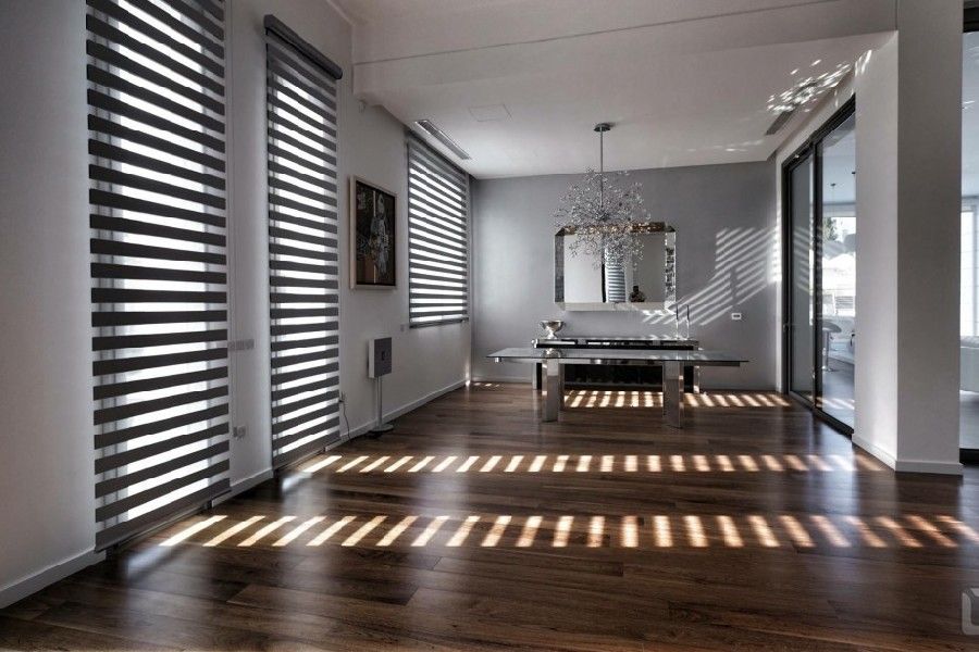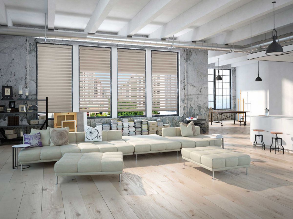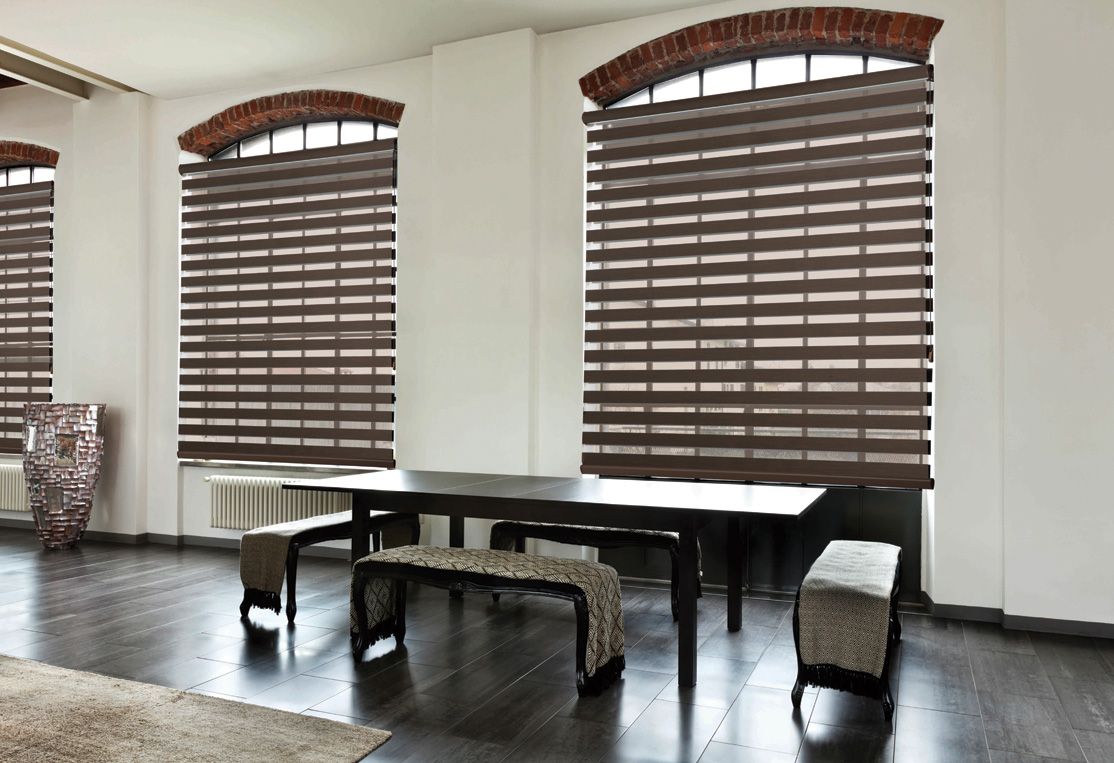 Ce store, créé en 2010, permet d’alterner entre une position de jour, qui jumelle les voilages des 2 toiles vous permettant une vision vers l'extérieur, et une position de soir qui déplace les bandes translucides de façon à vous offrir l'intimité la plus totale, et ce, peu importe la couleur ou la texture.